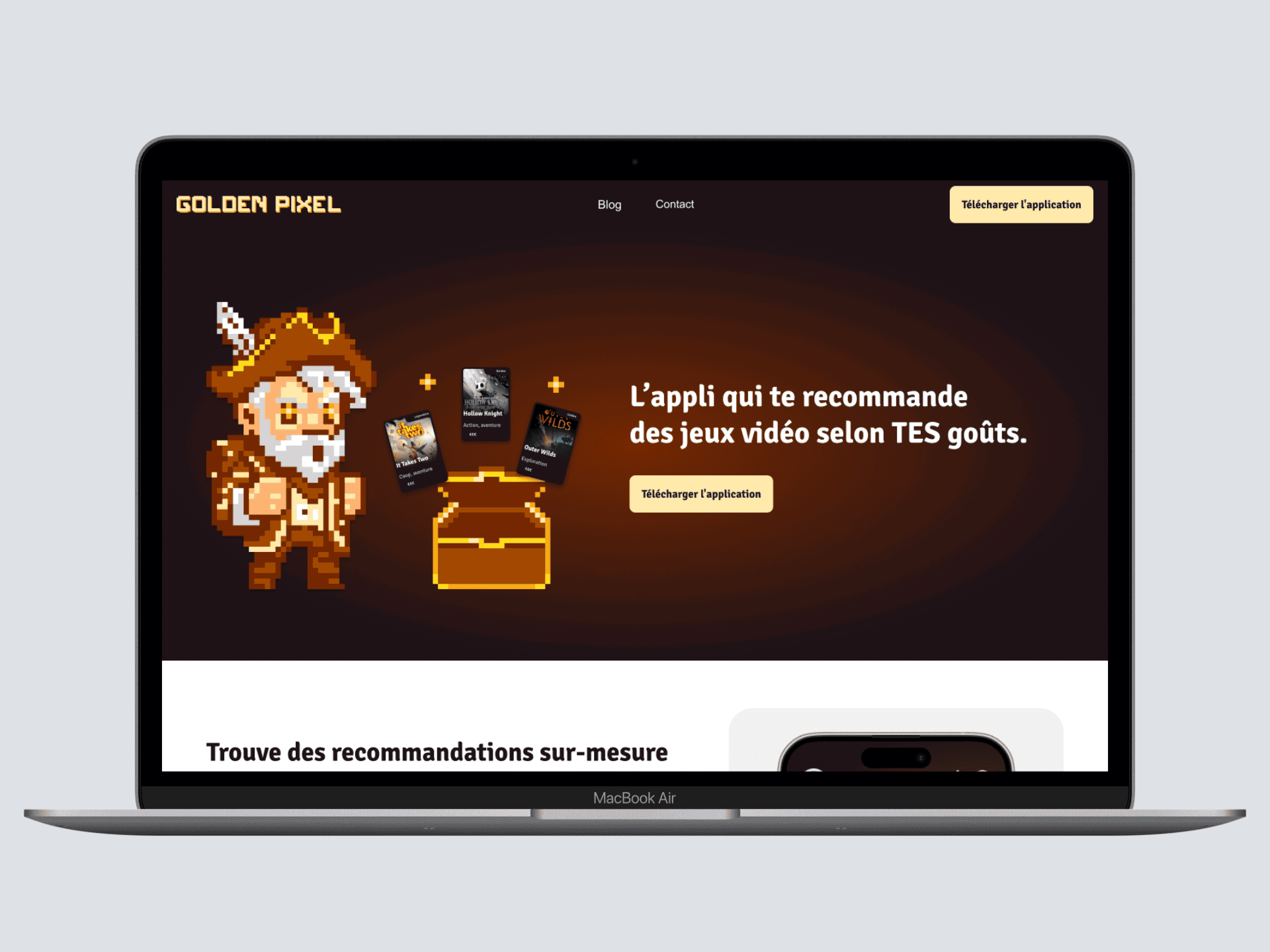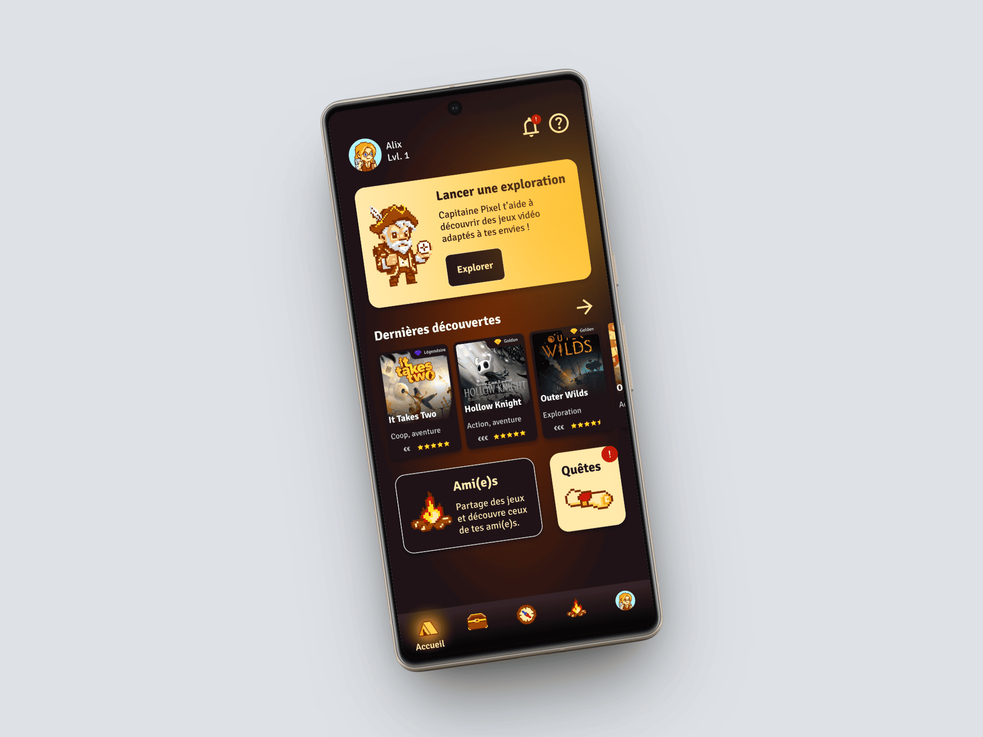 Golden Pixel est une application mobile qui réinvente la découverte de jeux vidéo à travers une expérience gamifiée et immersive. Guidés par la mascotte Capitaine Pixel, les utilisateurs explorent un univers où chaque recommandation devient une quête personnalisée.