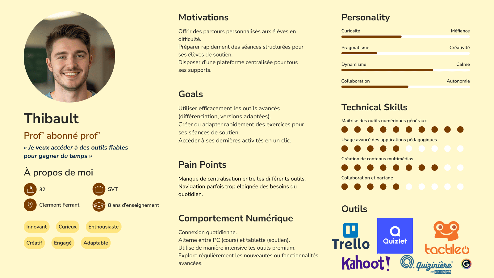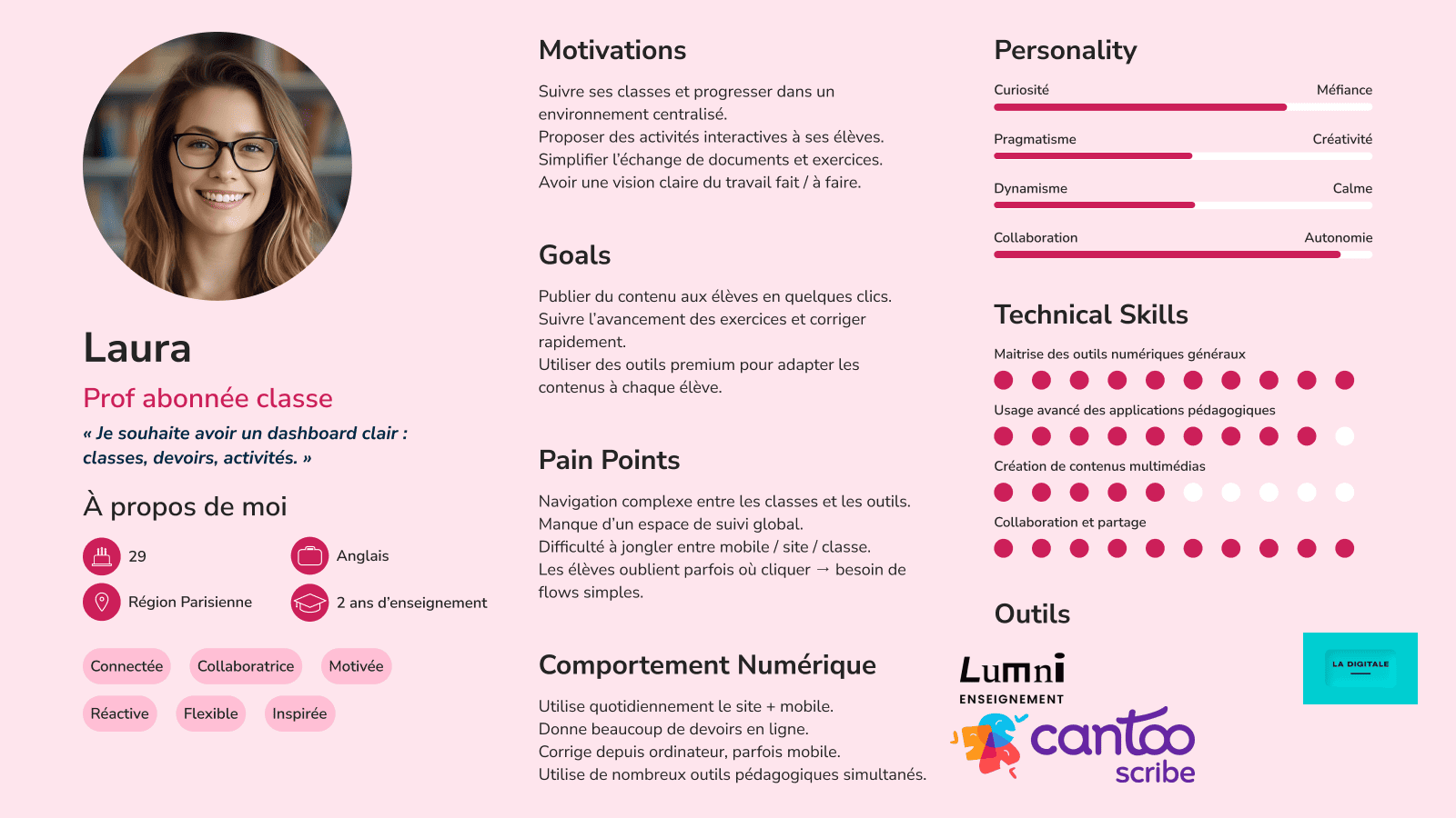 Les personas suivants ont été conçus pour comprendre leurs besoins, motivations et comportements pour concevoir un espace “Mon Espace 2025” cohérent.