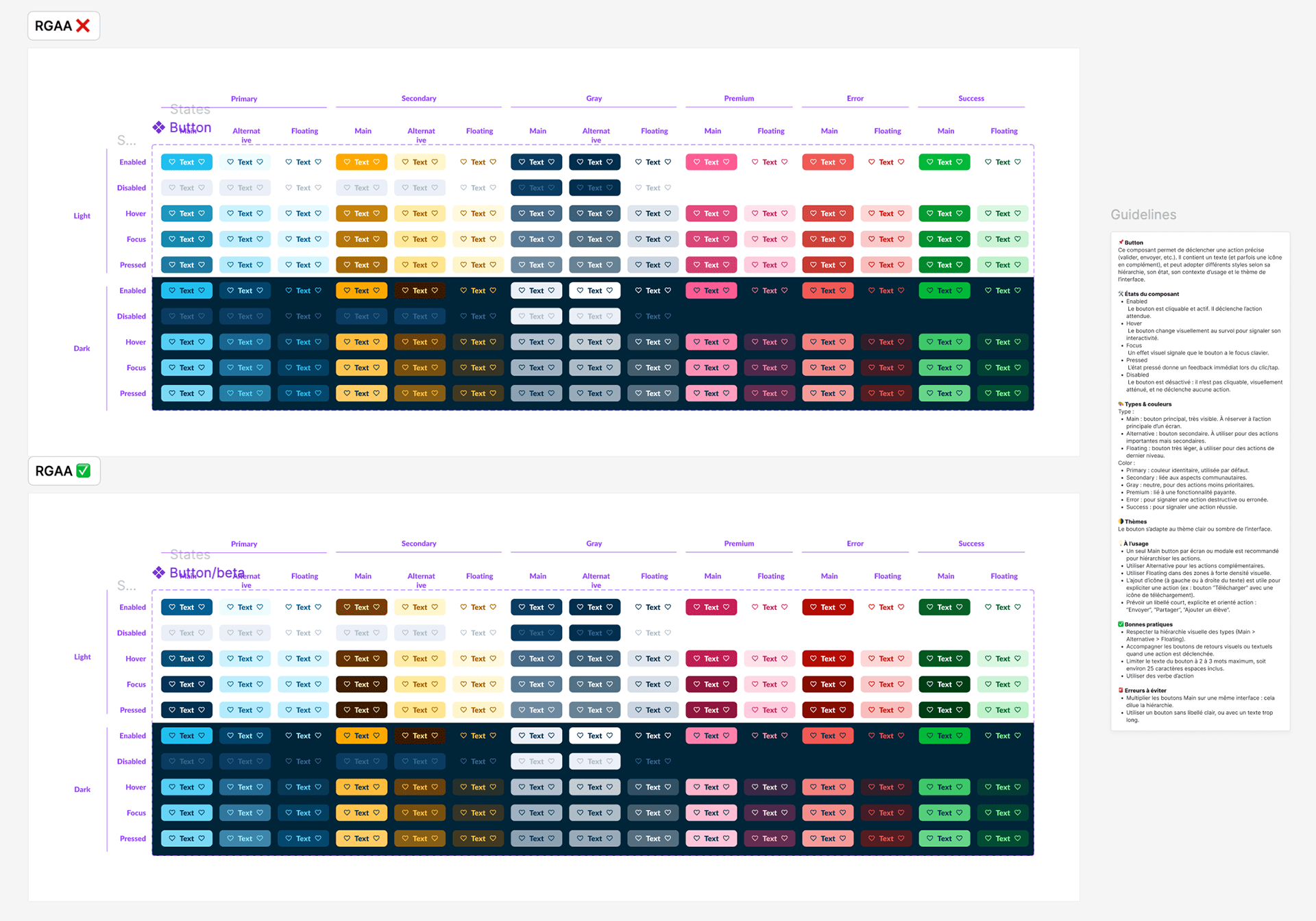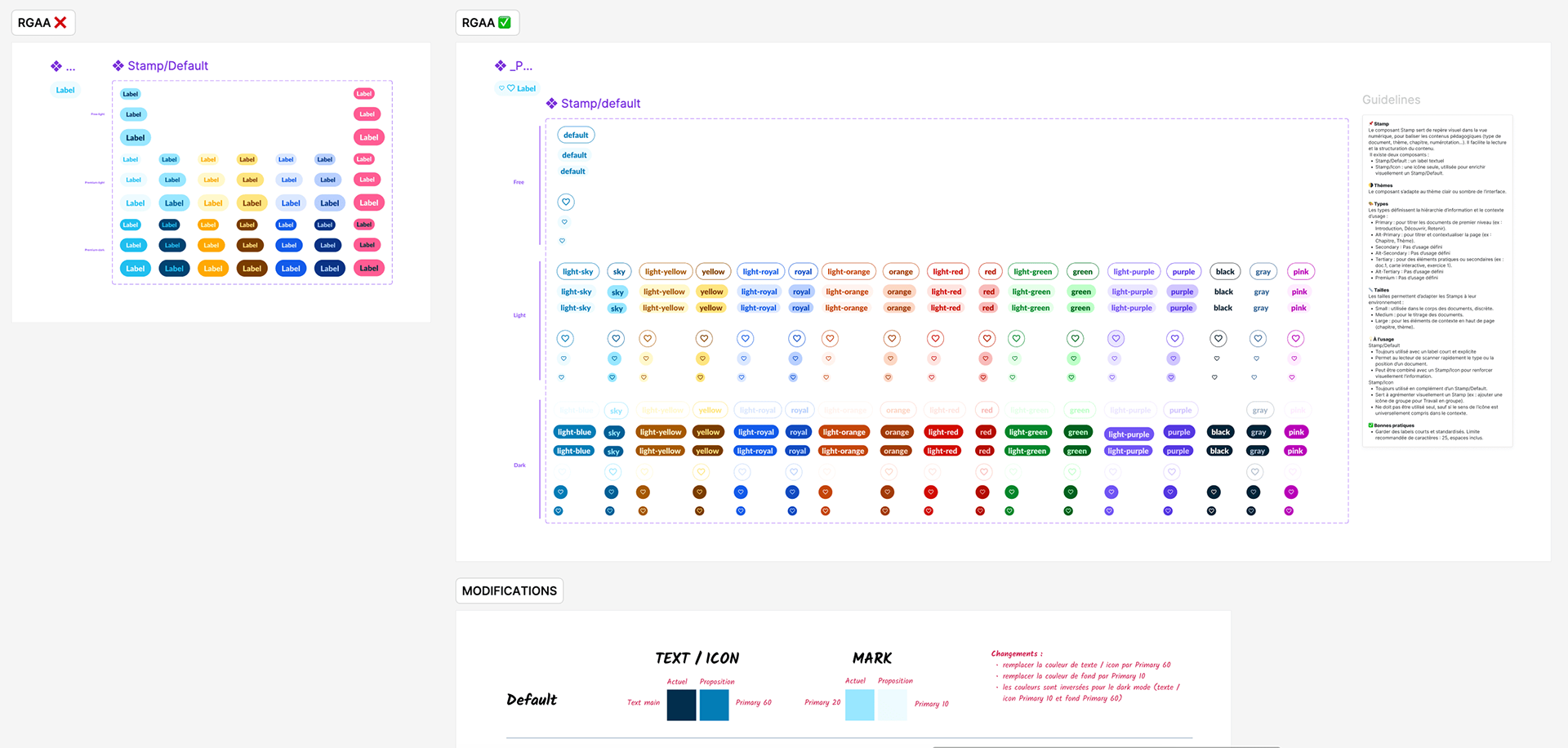 Pour illustrer cette démarche, je présente deux composants clés : les stamps (badges informatifs) et les boutons, entièrement repensés avec plusieurs niveaux d’importance, variations d’états et règles d’accessibilité. L’objectif : assurer une compréhension immédiate, une navigation intuitive et une conformité durable même lors des futures évolutions produit.